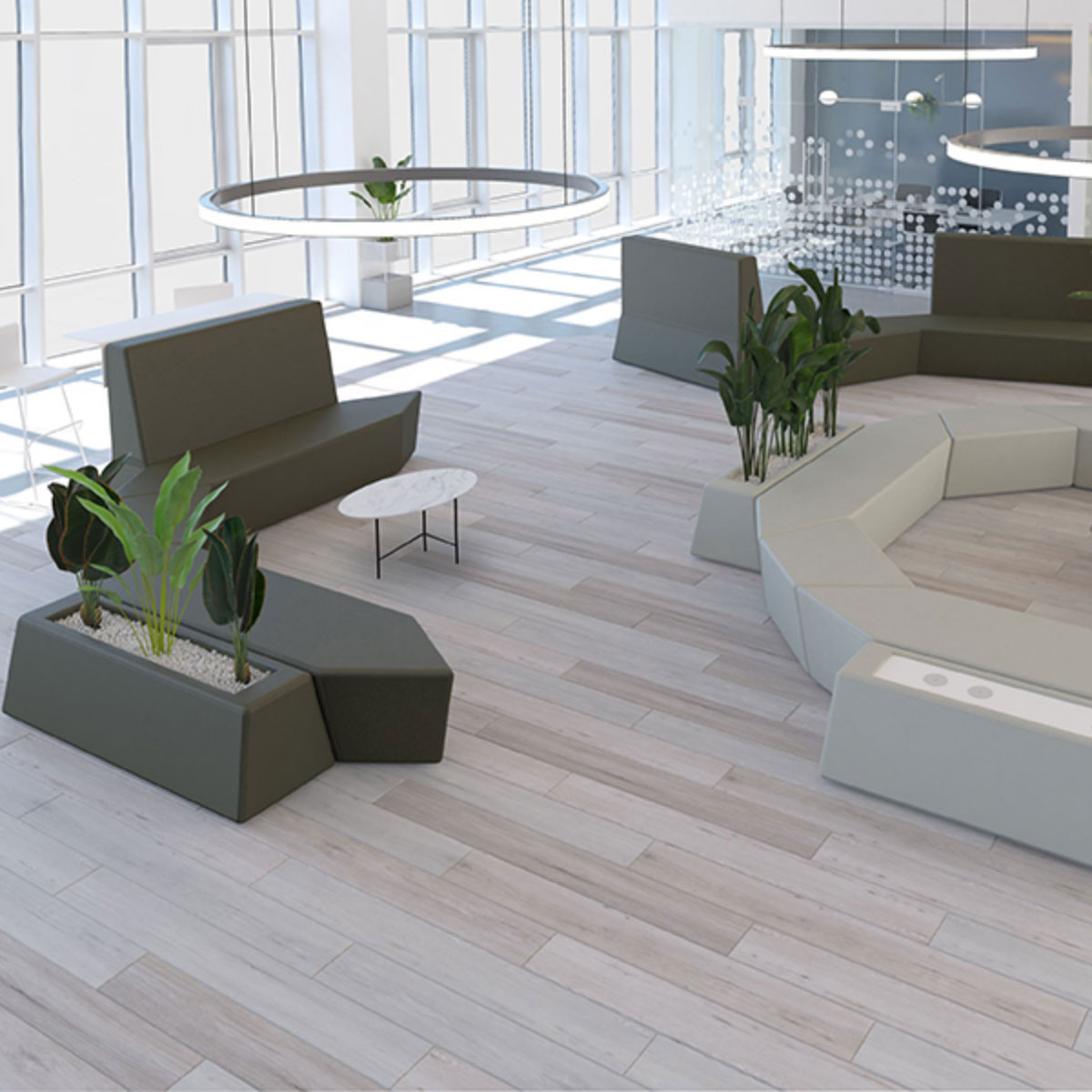 The product design had subsequent phases of simplification to achieve perfect modularity thanks to the 2 main elements: the bench and the joint. To these are added other complementary modules: an accessorised bench (with i-tech elements or a storage compartment) and a backrest (also available with desk).